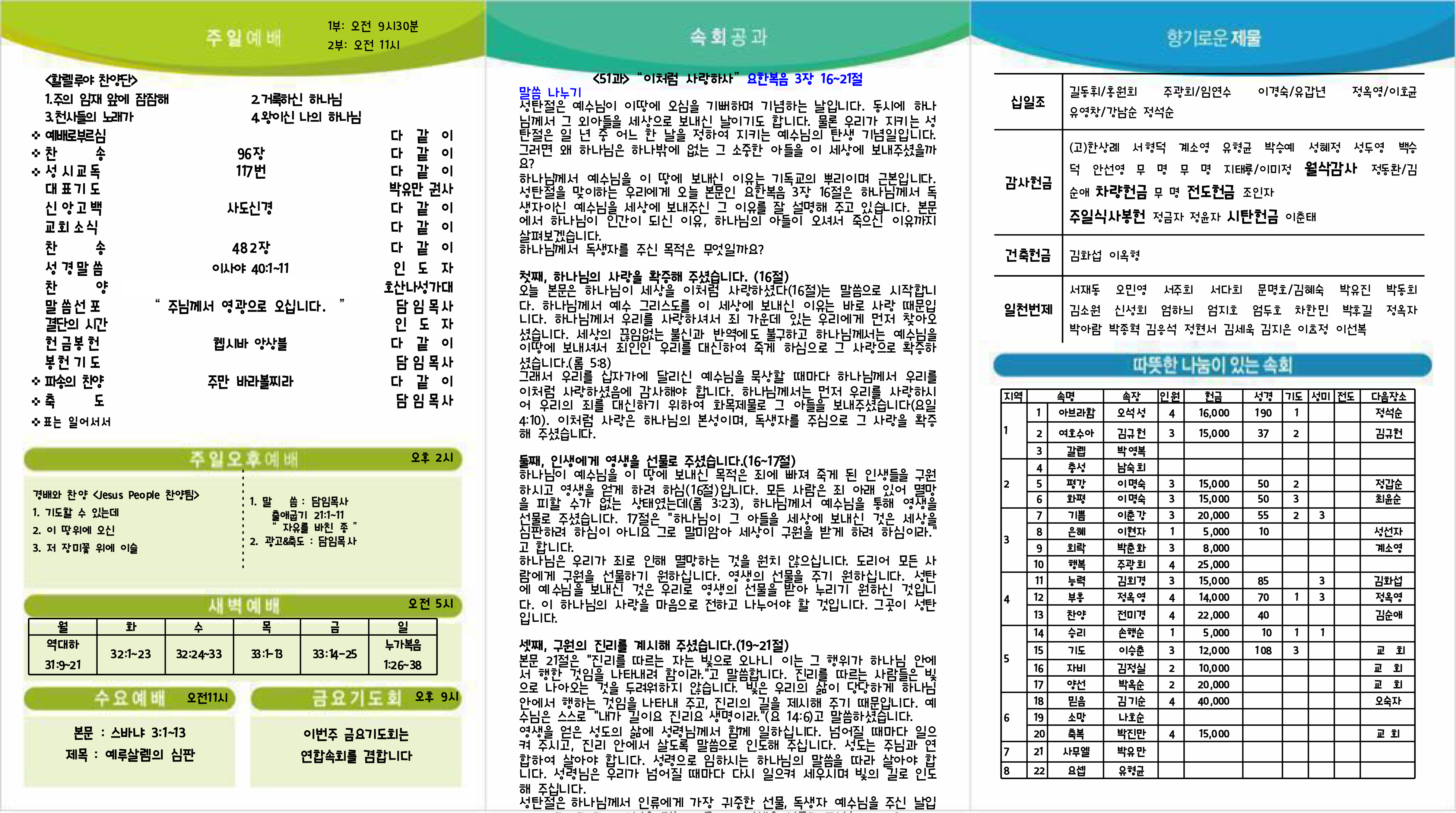| 이전글 | 2018년 12월 23일 교회소식 | 운영자 | 2018.12.26 | 0 | 118 |