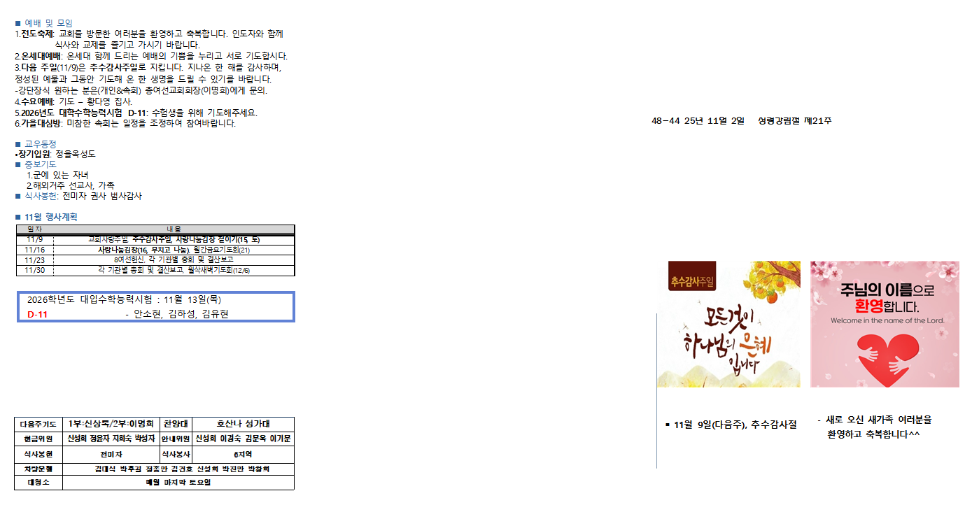 | 이전글 | 2025.11. 9 주보 | 운영자 | 2025.11.11 | 0 | 14 |